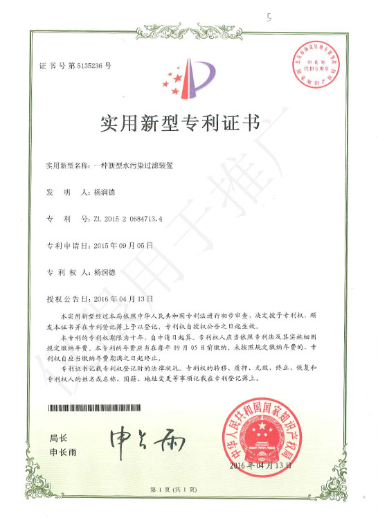 實(shí)用新型專利證書-一種新型水污染過濾裝置