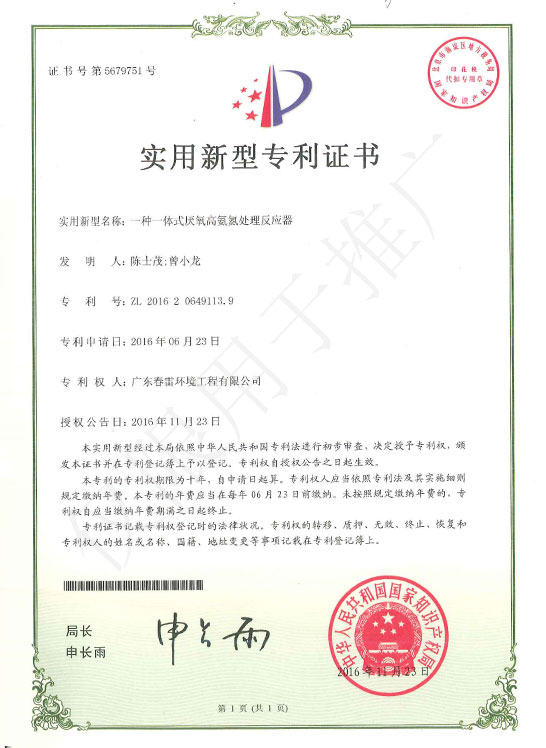 實(shí)用新型專利證書-一種一體式厭氧高氨氮處理反應(yīng)器