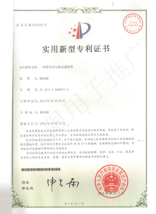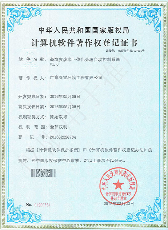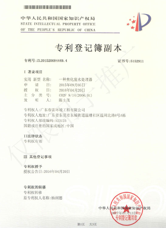 高濃度有機(jī)廢水可生化集成處理裝置實(shí)用新型專利證書